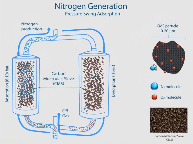 This pressure swing adsorption (PSA) method uses two CMS beds alternating between adsorption and regeneration, ensuring continuous nitrogen production.